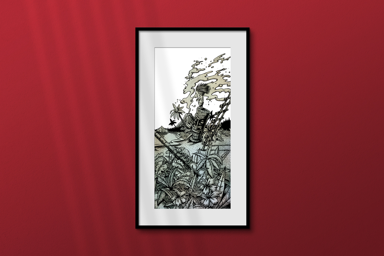 Custom surfboard design. Illustration inspired by the HIC symbol which includes an island, palm tree and an erupting volcano.